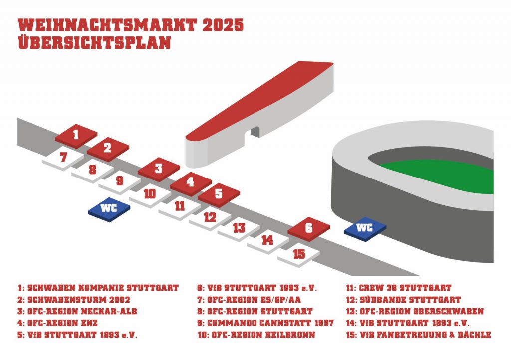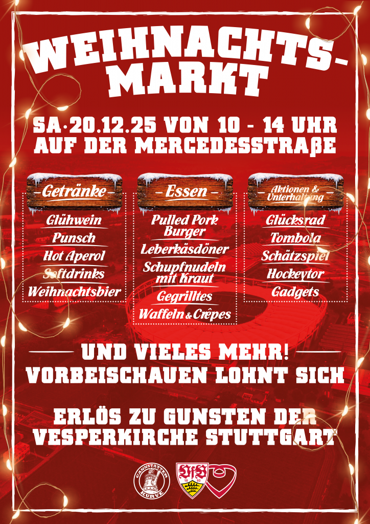 Glücksrad, Glühwein, Herzhaftes und Süßes – beim ersten gemeinsamen Weihnachtsmarkt der Cannstatter Kurve und des VfB ist am Samstag Einiges geboten. Los geht’s am Vormittag ab 10 Uhr auf der Mercedesstraße. Zwischen Porsche-Arena und dem Vorplatz der Cannstatter Kurve warten bis 14 Uhr insgesamt 15 liebevoll gestaltete Marktstände der organisierten Fanszene, der OFC-Regionen sowie des VfB e.V., der Fanbetreuung und dem VfB Dächle auf Jung und Alt. Sie bieten ein vielfältiges kulinarisches Angebot sowie Aktionen rund um die VfB-Familie. Der gesamte Erlös des gemeinsamen Weihnachtsmarkts geht an die VfB-Stiftung Brustring der Herzen, die damit die Stuttgarter Vesperkirche unterstützen wird.